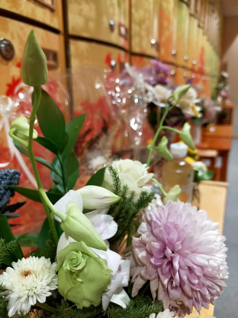 納骨堂内は寒さのおかげで供花がきれいに咲いており、静かな彩りを添えております。