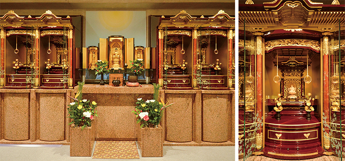 木製部分は、天然漆をしのぐ品質の高さをもち、日本の美の工芸品に使用されるカシュー塗りで、格天井や欄間には金箔をあしらい宮殿に座する薬師如来像はすべて手彫の青山霊廟特注品となります。両脇の柱は白檀塗りの蒔絵仕上げをほどこし、下部の扉は御影石を曲面に加工し、こだわりのある造りとなっております。